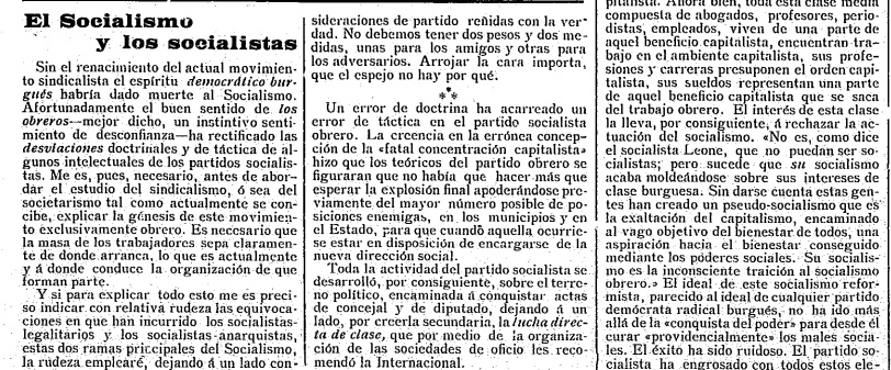 Se me dirá que los sindicatos no son un santuario de pureza doctrinal ni de virtudes socialísticas… No se trata de esto. ¿Lo son acaso los partidos para que desdeñemos aquellos por éstos? La cuestión es otra. Es que los sindicatos tienen una base de intereses económicos y un carácter de clase que no tienen los partidos. Y esto es la médula del Socialismo, es toda su razón de ser. La emancipación del proletariado ha de salir de esta lucha de clase por intereses económicos.