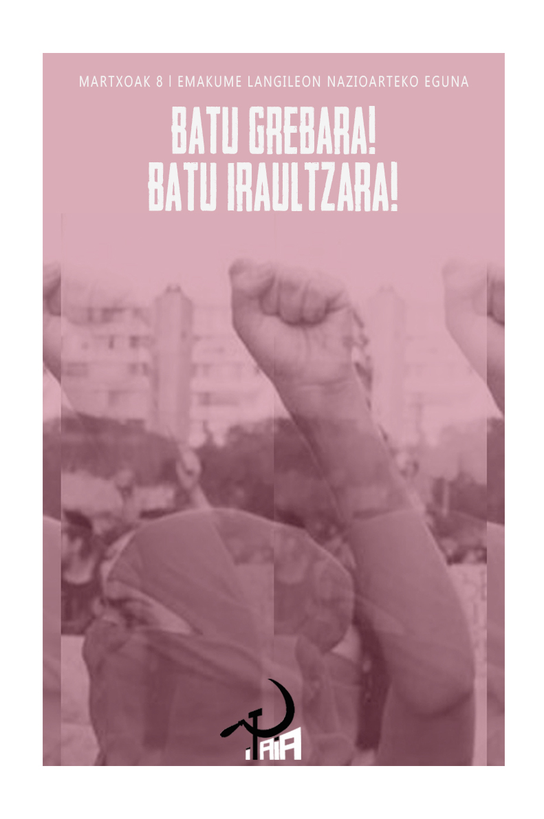 Por todo esto, como declaramos en la primera entrada para este 8 de marzo, hacemos un llamamiento a toda la clase trabajadora de Euskal Herria a actuar con independencia de clase y a favor de los intereses de las mujeres trabajadoras en esta huelga feminista. Con el peligro de que las fotos de calles llenas de mujeres del 9 de marzo ensombrezcan el estado de la mujer trabajadora, es vital que las que compartimos y defendemos los intereses de las desposeídas ocupemos la primera línea. Debemos ocupar la primera línea para evitar que la mujer trabajadora se mueva bajo banderas posmodernas, debemos ocupar la primera línea para debatir sobre el planteamiento de la huelga feminista de este año, y también para poner sobre la mesa todos los elementos con los que debería contar una huelga de trabajadoras. Tenemos claro, aun así, que la batalla real no se celebrará sólo este 8 de marzo, sino en la organización de una lucha de décadas, en la cual es imprescindible que lo demos todo para reforzar la capacidad política de las trabajadoras.
